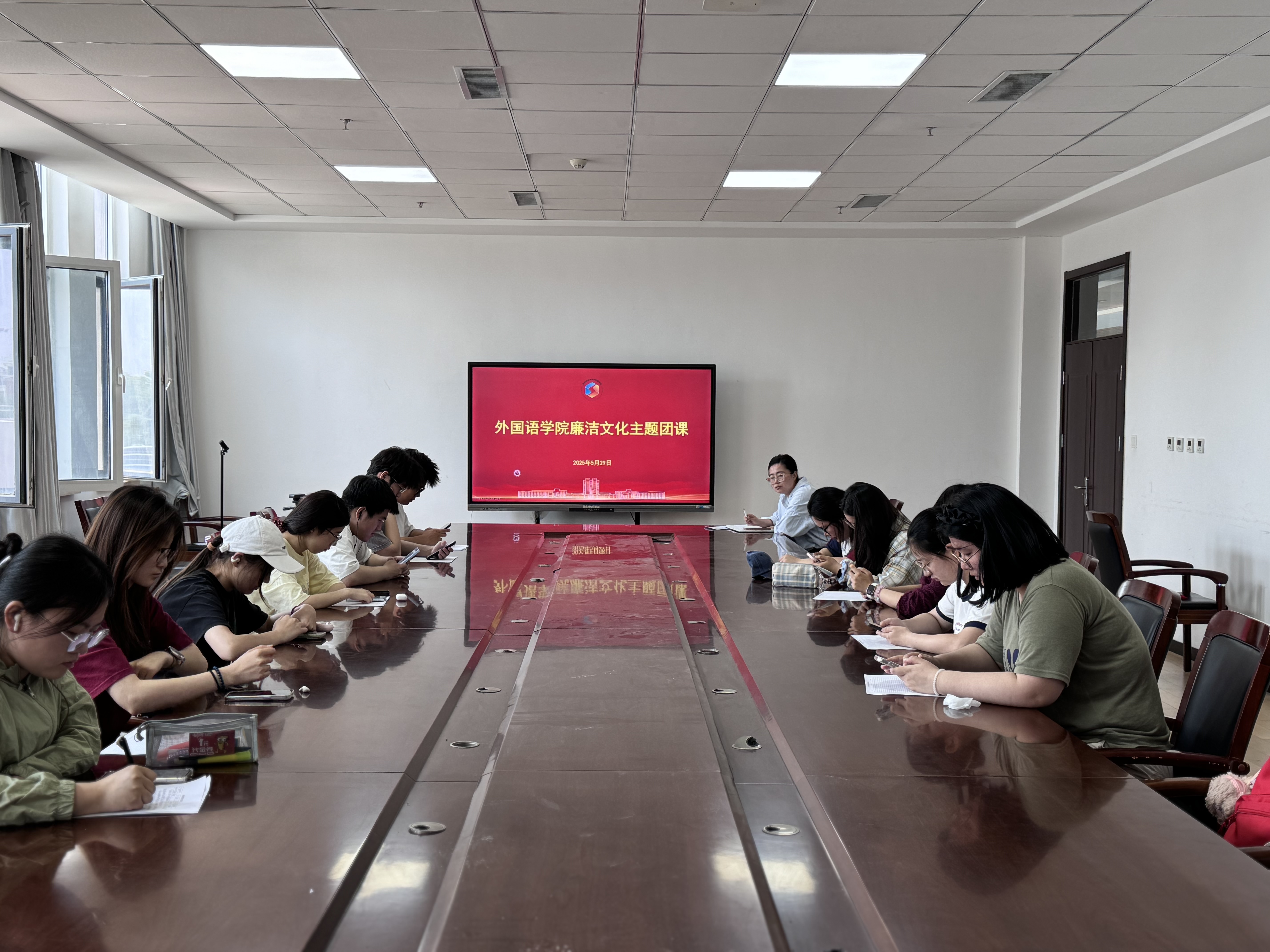 5月29日,外國語學(xué)院團(tuán)委書記線郁在平度校區(qū)大學(xué)生活動(dòng)中心201會(huì)議室講授廉潔文化主題團(tuán)課,輔導(dǎo)員仇文峰、鄒曉婷及全體學(xué)生骨干線上線下參加。
