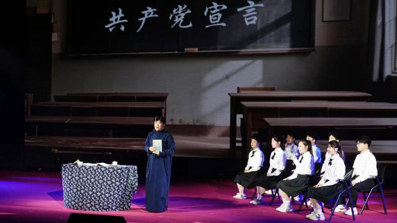最后,老師與學(xué)生們的激昂宣言“以聲為劍,劈開國際講壇上偏見的迷霧;以筆為媒,搭建文明對話的橋梁”,將劇情推向高潮,深刻詮釋了新時代外語青年傳承先輩精神、擔(dān)當(dāng)時代使命的決心。整場演出巧妙融合燈光變幻與PPT場景切換,配合演員們飽含深情的演繹,讓觀眾在沉浸式體驗(yàn)中深刻感悟到“先鋒”精神的時代內(nèi)涵。