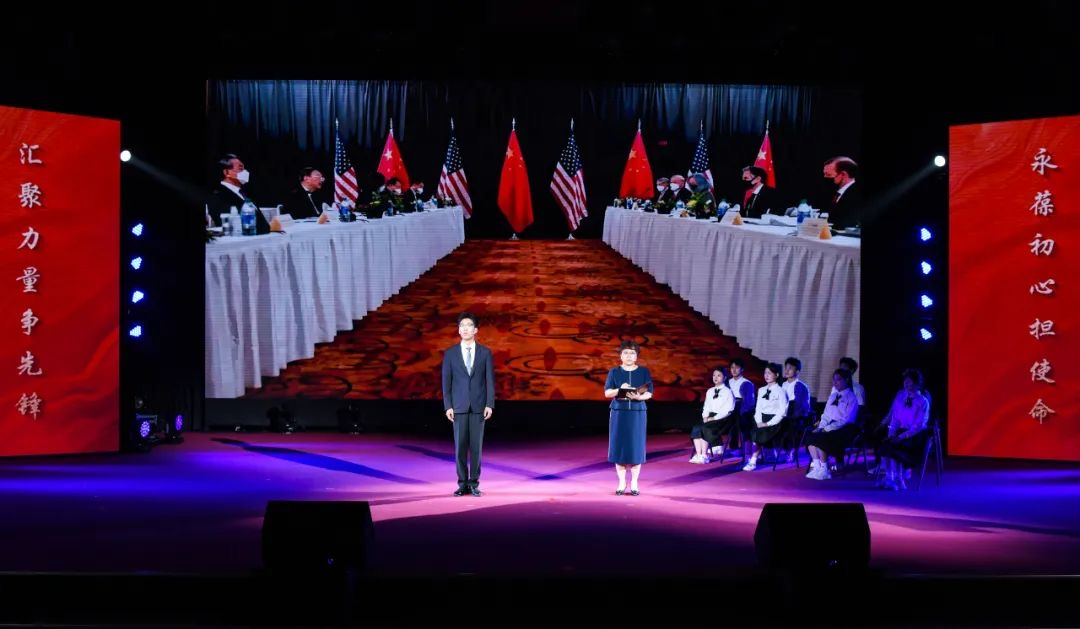 第三幕則將目光投向當(dāng)下,再現(xiàn)中美高層會談的緊張場景。中國外交官楊潔篪義正辭嚴(yán)的表態(tài),搭配翻譯張京精準(zhǔn)流暢的同聲傳譯,展現(xiàn)了新時代中國外交官在國際舞臺上用智慧與信念捍衛(wèi)國家尊嚴(yán)、爭取話語權(quán)的風(fēng)采,詮釋了“先鋒”精神在當(dāng)代的延續(xù)。