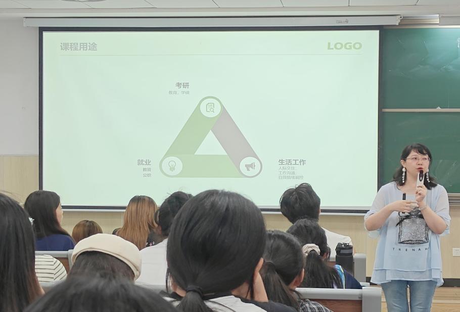 于佳圍繞“英語+”這一新文科核心理念,為學(xué)生學(xué)業(yè)規(guī)劃提供了針對性建議,強調(diào)需充分了解就業(yè)市場并提前規(guī)劃大學(xué)課程。于佳介紹了《教育能力與教學(xué)綜合素質(zhì)》拓展課程及英語專業(yè)考研的四大主要方向,幫助同學(xué)們理解課程學(xué)習(xí)與未來發(fā)展的緊密聯(lián)系。同時還結(jié)合往屆學(xué)生德語四六級情況及優(yōu)秀學(xué)姐發(fā)展路徑,鼓勵大家提前謀劃,提升在考研、考公、考編等競爭中的綜合實力。