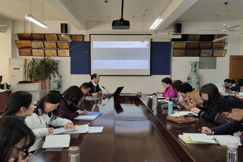 11月7日,外國語學院在文經(jīng)樓會議室開展“不忘初心牢記使命”主題教育活動,學院黨委書記王仁高、副院長李春梅為全體教職工上專題黨課。