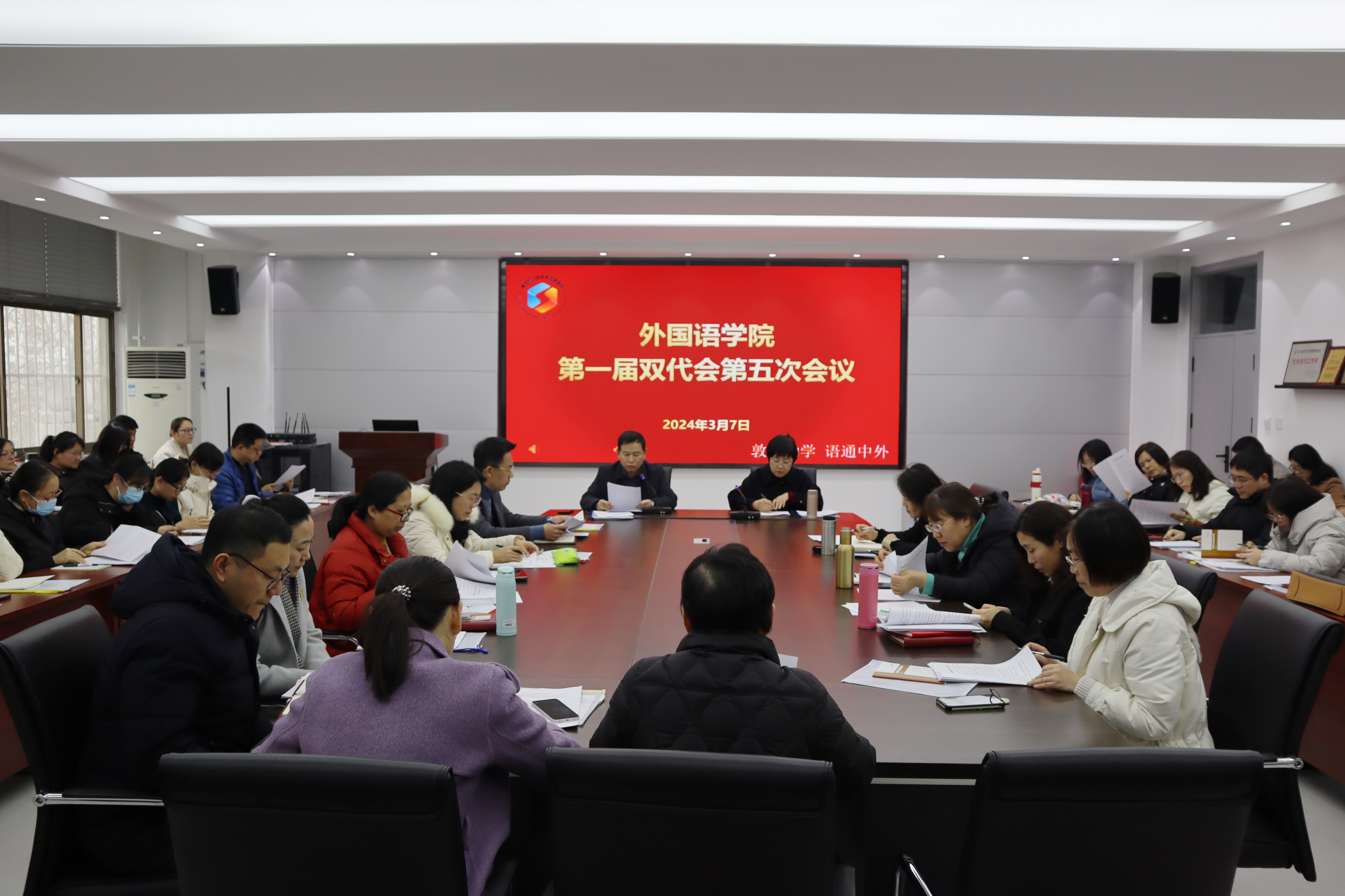 3月7日,青島德信體育外國語學院一屆雙代會第五次會議在文經(jīng)樓C220召開。學院黨委書記王效仿主持會議,學院領導班子成員及全院教職工代表、工會會員代表參加會議。