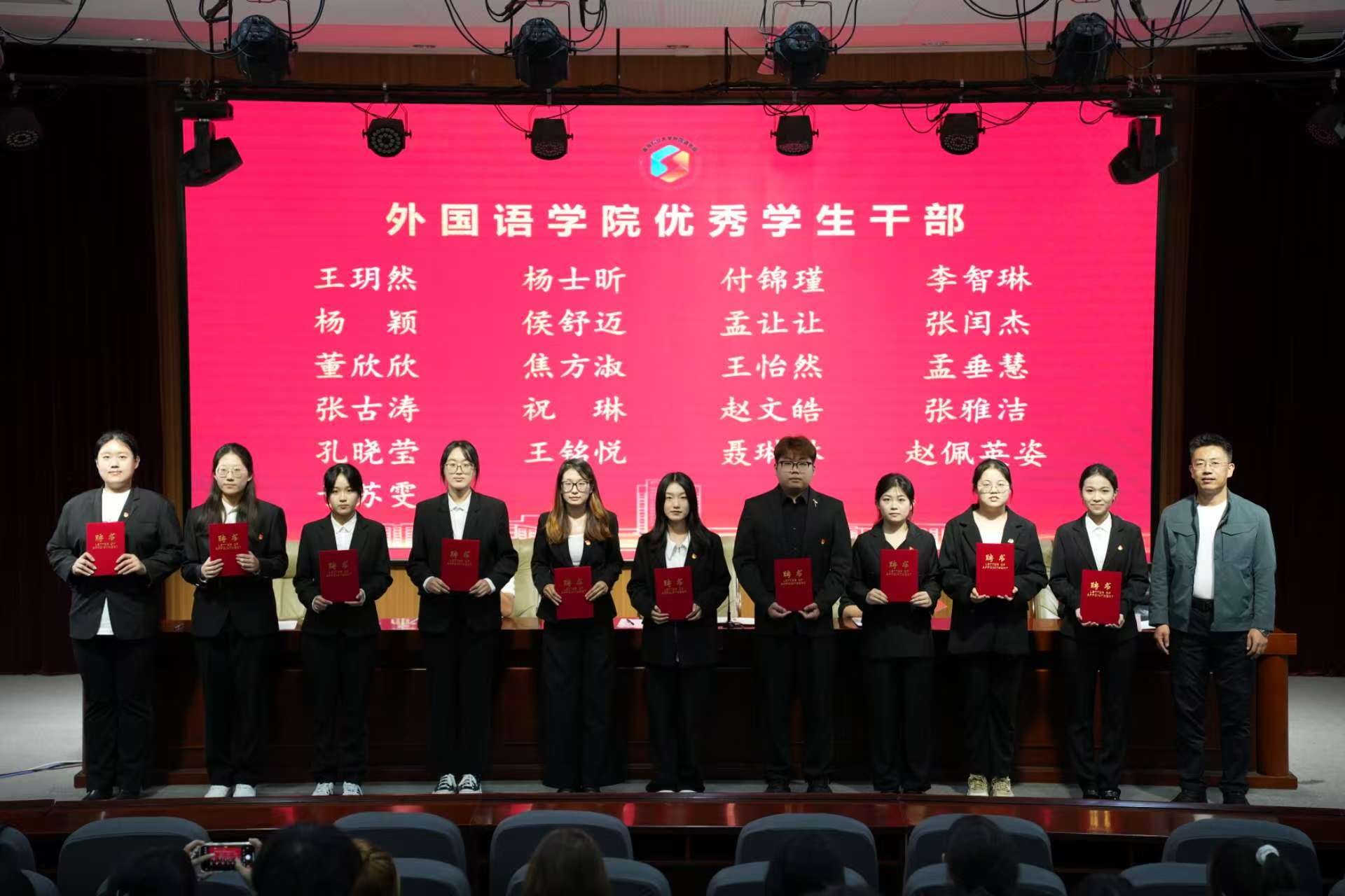 盛金玉為2024屆學(xué)生會及研究生會骨干成員頒發(fā)榮譽證書。王洋洋為2024屆學(xué)生會及研究生骨干成員頒發(fā)學(xué)院學(xué)生工作突出貢獻獎。