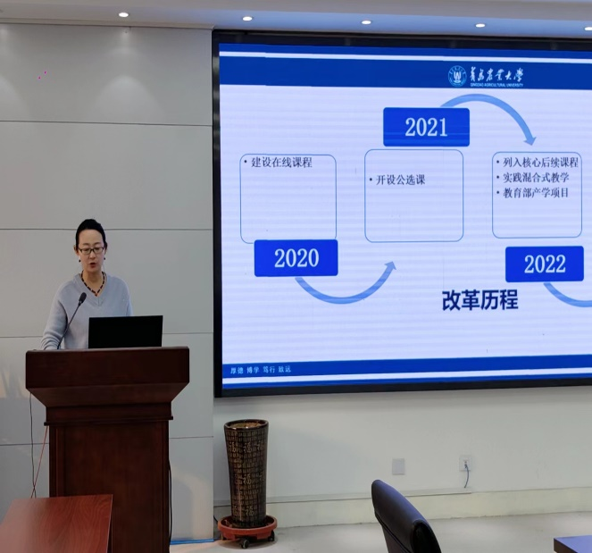 我校是山東省首批中華傳統(tǒng)優(yōu)秀文化傳承示范校,人才培養(yǎng)目標是培養(yǎng)知農(nóng)愛農(nóng)高素質(zhì)應(yīng)用研究型人才。結(jié)合學(xué)校辦學(xué)定位,大學(xué)英語第一教學(xué)部構(gòu)建了農(nóng)業(yè)特色課程群,主要包括中國農(nóng)業(yè)文化、中國農(nóng)業(yè)簡史、黃河文化概況、農(nóng)耕文化翻譯、學(xué)術(shù)英語、大學(xué)英語四、體驗英語等豐富的課程,各課程組展開深入討論,從教學(xué)設(shè)計思路、教學(xué)環(huán)境、教學(xué)方法、創(chuàng)新特色、教學(xué)效果與評價等多維角度對本門課程進行深入解析。