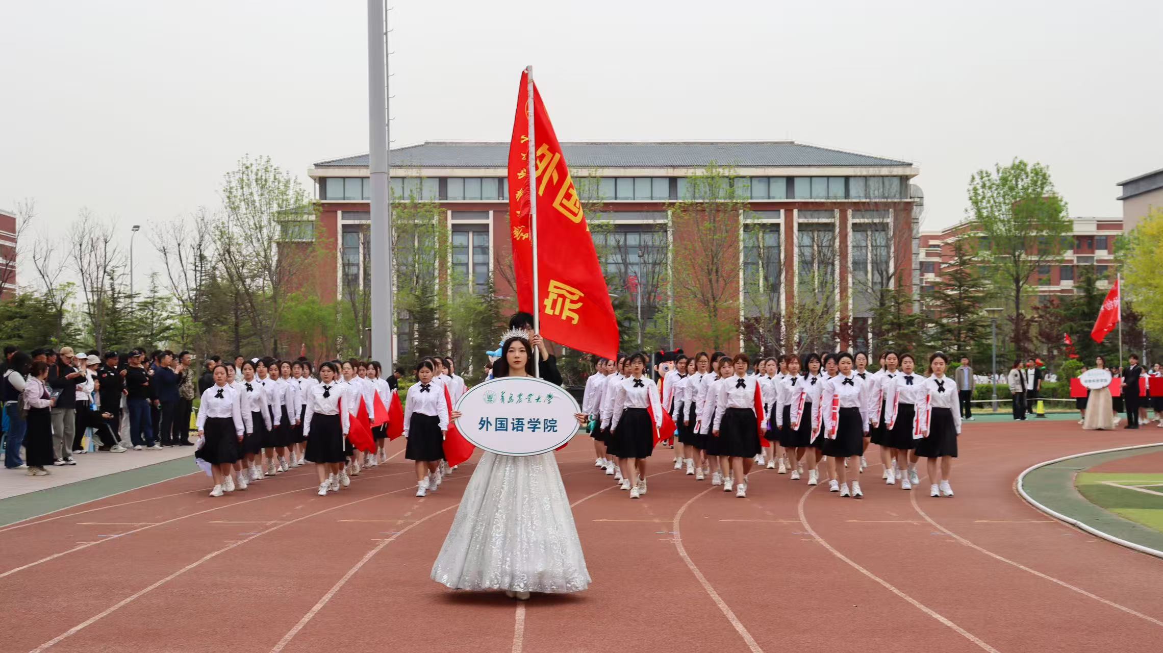 外國(guó)語(yǔ)學(xué)院“虹子初心”代表方隊(duì)在開幕式中大放異彩,彩帶飄揚(yáng),紅旗躍動(dòng),青春與夢(mèng)想交織。象征著“虹文化”的七色彩帶穿梭飛揚(yáng),好似青春的調(diào)色盤,繪出絢爛多彩的畫卷,寓意著外國(guó)語(yǔ)學(xué)院學(xué)生們豐富多彩的校園生活與無(wú)限可能的未來(lái)。舞動(dòng)的紅旗,映著青春的面龐,展現(xiàn)出當(dāng)代大學(xué)生的拳拳愛國(guó)心,彰顯著他們對(duì)祖國(guó)的深深熱愛與崇高敬意。列隊(duì)學(xué)生代表身穿黑白相間學(xué)院風(fēng)制服,精神抖擻、步伐整齊、口號(hào)嘹亮,斗志昂揚(yáng),充分展示了新時(shí)代外語(yǔ)人的自信與激情。