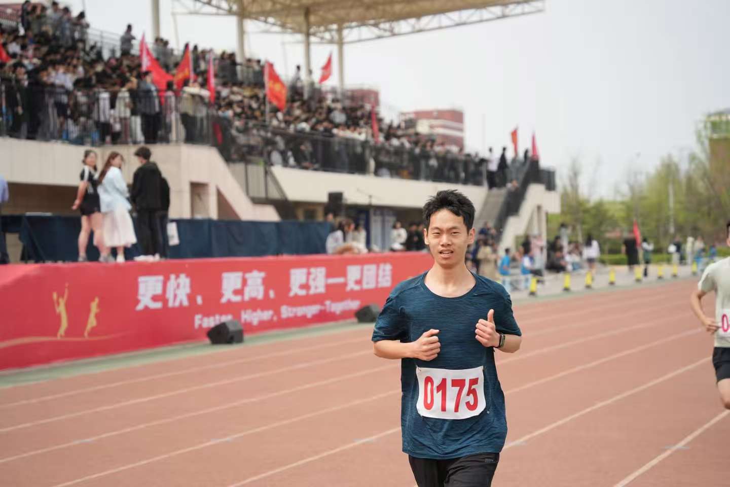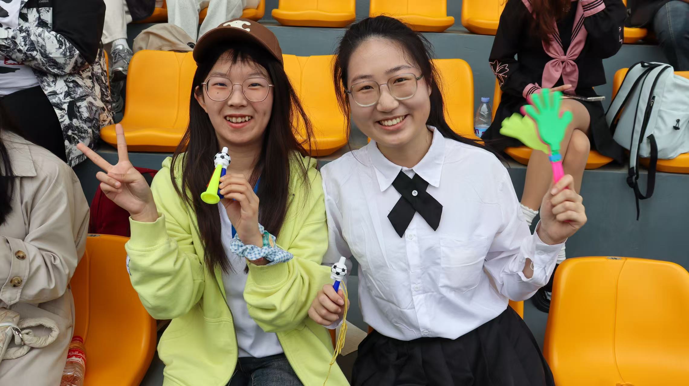 賽場(chǎng)外,外國(guó)語(yǔ)學(xué)院師生全力應(yīng)援,是運(yùn)動(dòng)員堅(jiān)實(shí)的后盾。啦啦隊(duì)員身著多巴胺色系隊(duì)服,色彩明快活潑,洋溢著青春活力。她們動(dòng)作整齊劃一,節(jié)奏精準(zhǔn),每一個(gè)動(dòng)作都充滿力量與激情,為運(yùn)動(dòng)員注入拼搏動(dòng)力。志愿者們?cè)谘a(bǔ)給站、檢錄處不停忙碌,為運(yùn)動(dòng)員遞水、引導(dǎo)檢錄,默默保障賽事順利進(jìn)行。觀眾席上,大家熱情高漲,奮力為運(yùn)動(dòng)員加油助威。