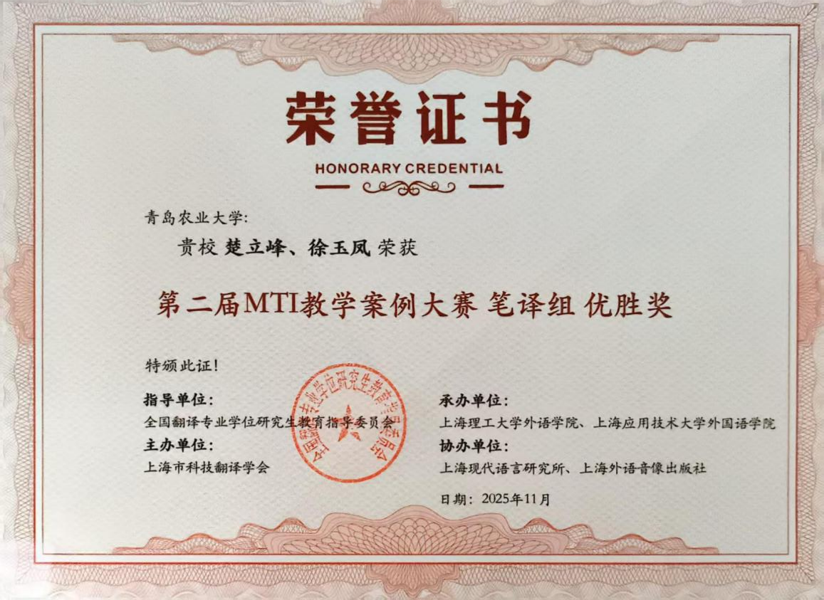 大賽共設(shè)筆譯、口譯、翻譯技術(shù)、翻譯項(xiàng)目管理四個(gè)組別,吸引了來(lái)自全國(guó)122所院校的227份教學(xué)案例參賽。經(jīng)過(guò)多輪專(zhuān)家評(píng)審,最終評(píng)選出一、二、三等獎(jiǎng)及優(yōu)勝獎(jiǎng)。我院教師王珍團(tuán)隊(duì)的《中國(guó)農(nóng)業(yè)特色文化翻譯實(shí)踐中的理解與表達(dá)》獲筆譯組三等獎(jiǎng),丁樹(shù)亭團(tuán)隊(duì)的《筑基農(nóng)學(xué)術(shù)語(yǔ)標(biāo)準(zhǔn),擎畫(huà)戰(zhàn)略興農(nóng)新程》獲翻譯技術(shù)組三等獎(jiǎng)。鞠志勤團(tuán)隊(duì)的《農(nóng)業(yè)科技英語(yǔ)名詞化結(jié)構(gòu)的翻譯與譯后編輯》、孫海琳?qǐng)F(tuán)隊(duì)的《天下興亡,譯夫有責(zé)一一我國(guó)翻譯史上的原本選擇》以及楚立峰團(tuán)隊(duì)的《筆譯理論與技巧》獲筆譯組優(yōu)勝獎(jiǎng)。此次比賽我校積極組織多支參賽隊(duì)伍,且表現(xiàn)優(yōu)異,主辦方特頒發(fā)優(yōu)秀組織獎(jiǎng)。