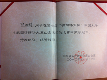 郭麗娟(右一)榮獲2012年第七屆“錦湖韓亞杯”中國大學(xué)生韓國語演講大賽山東賽區(qū)一等獎(jiǎng)