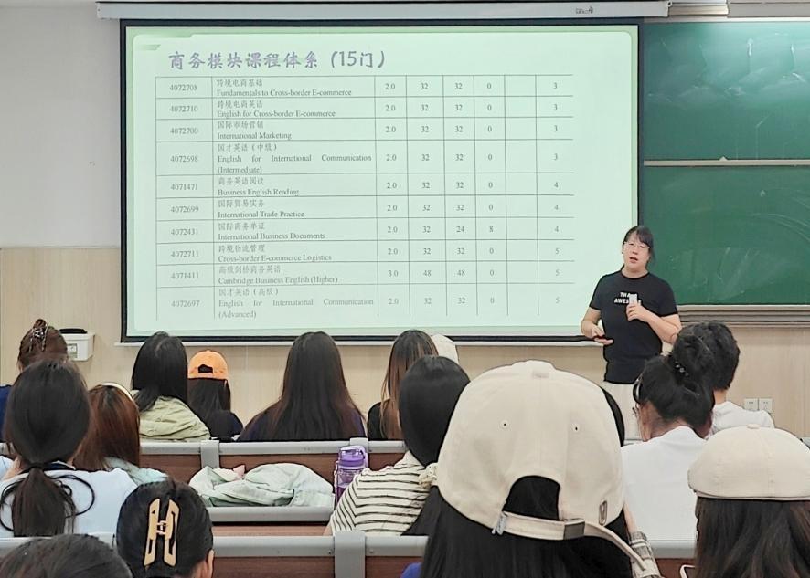 為助力2024級英語專業(yè)學(xué)生深入了解專業(yè)課程體系,科學(xué)規(guī)劃大學(xué)學(xué)習(xí)生活,6月13日,外國語學(xué)院英語系于平度校區(qū)博學(xué)樓A102舉辦選課指導(dǎo)講座。本次講座由英語系主任徐玉鳳、英語系副主任兼跨境電商專業(yè)負責(zé)人左燕茹、英語系教師于佳、高艷艷擔(dān)任主講,為學(xué)生提供了全面實用的課程解析與學(xué)業(yè)規(guī)劃指導(dǎo)。