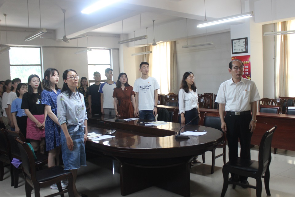 7月1日,青島德信體育外國語學院在文經樓會議室舉行黨員宣誓儀式。學院黨委書記王仁高、團委書記嵇安奕、正科級輔導員劉艷出席,全體學生黨員參加。儀式由嵇安奕主持。