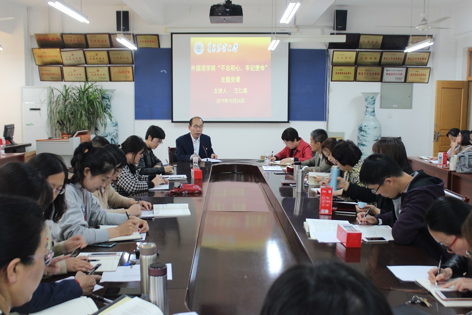 根據(jù)!安煌跣 牢記使命”主題教育工作要求,10月24日下午,外國語學(xué)院黨委書記王仁高以“堅(jiān)持問題導(dǎo)向,努力提高人才培養(yǎng)質(zhì)量”為題,結(jié)合調(diào)研情況和學(xué)生成長(zhǎng)評(píng)價(jià)報(bào)告,為全院教職工黨員黨課。學(xué)!安煌跣、牢記使命”主題教育指導(dǎo)組成員叢鵬出席。學(xué)院非黨員教師參加了黨課。