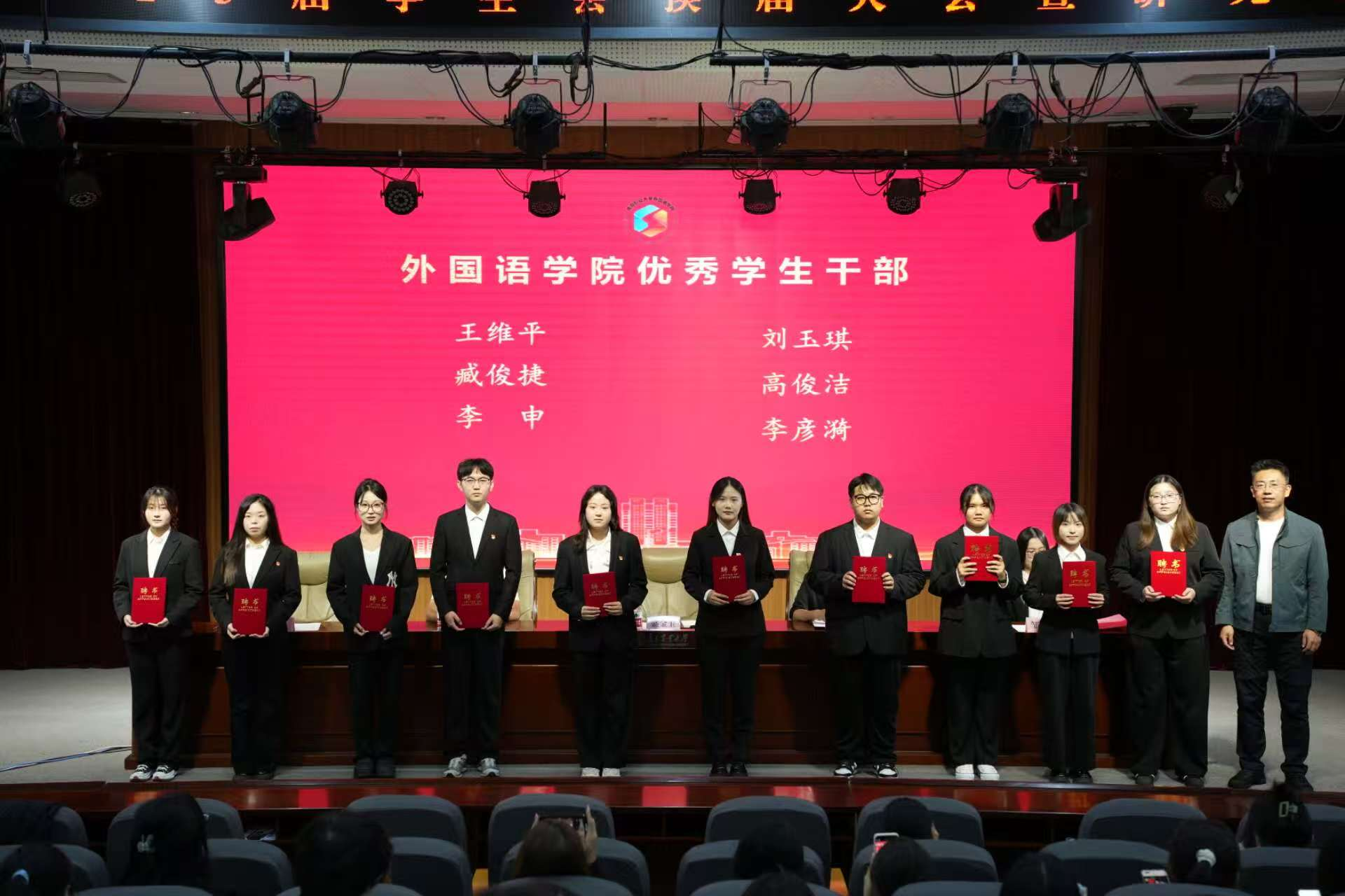 9月23日,外國語學院于學術會館第二報告廳召開2025屆學生會暨研究生會換屆大會。外國語學院黨委副書記、副院長盛金玉,團委書記線郁,輔導員王洋洋、鄒曉婷、張玉靈出席大會。2024屆、2025屆學生會和研究生會、2024級全體學生骨干參加,大會由線郁主持。