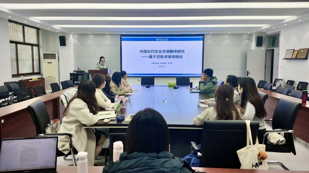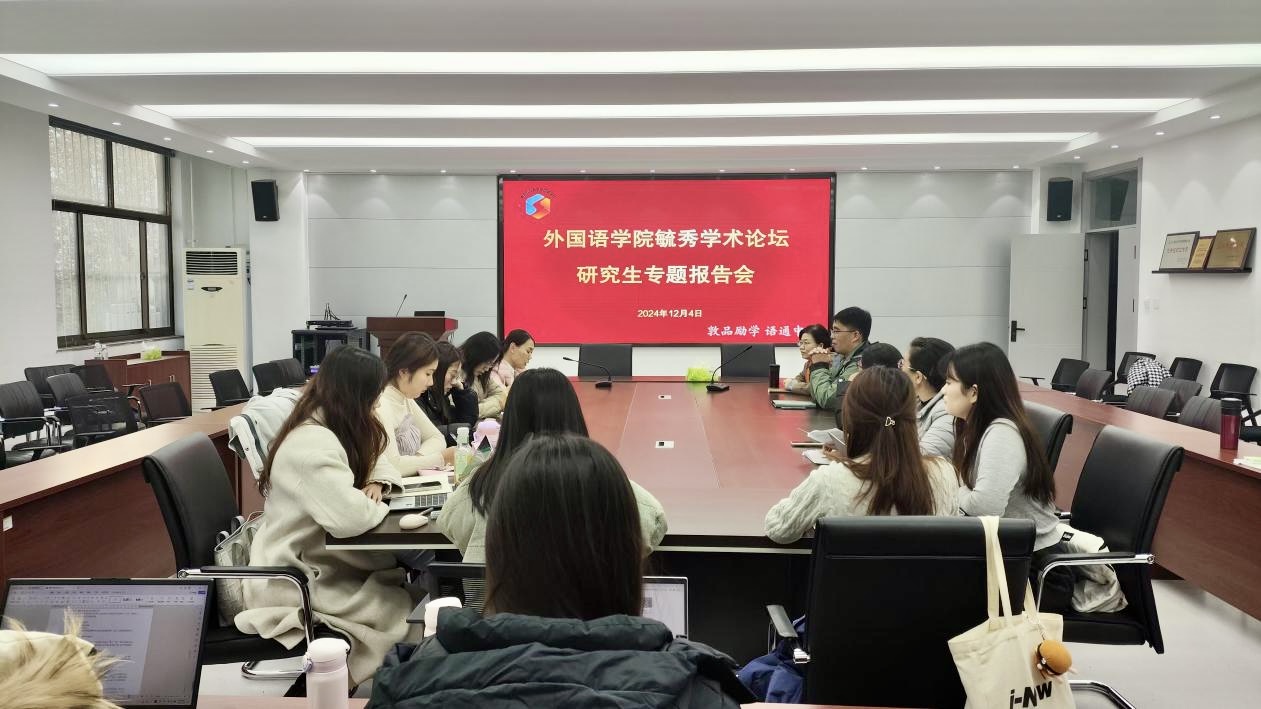 12月4日下午,外國語學(xué)院在文經(jīng)樓C220會議室舉辦毓秀學(xué)術(shù)論壇研究生專題報告會。會議由MTI教育中心主任姚雪麗主持,學(xué)院研究生導(dǎo)師參會并點(diǎn)評指導(dǎo),2023級、2024級研究生與會學(xué)習(xí)。