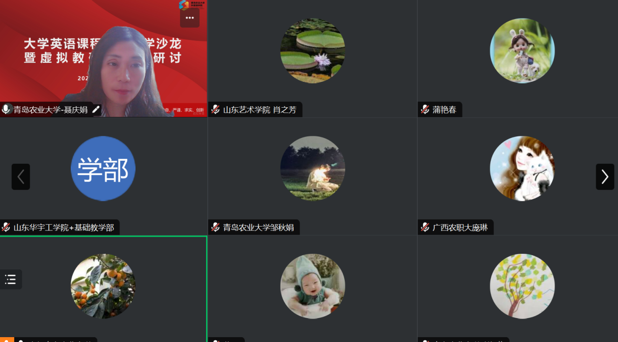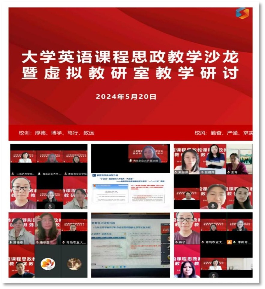 2024年5月20日,外國語學院大學英語第二教學部聯(lián)合山東藝術(shù)學院、廣西農(nóng)業(yè)職業(yè)技術(shù)大學、山東華宇工學院共同舉辦了課程思政教學沙龍第五期暨虛擬教研室教學研討活動,來自四所高校的近50名大學英語教師參與線上活動。此次活動由大學英語備課組長李卿主持,教學部主任聶慶娟做主題發(fā)言,其他三所院校教師參與了討論;顒右灾R圖譜構(gòu)建為核心,旨在探討數(shù)字化背景下的課程思政教學實踐,推動外語教育教學數(shù)字化轉(zhuǎn)型。