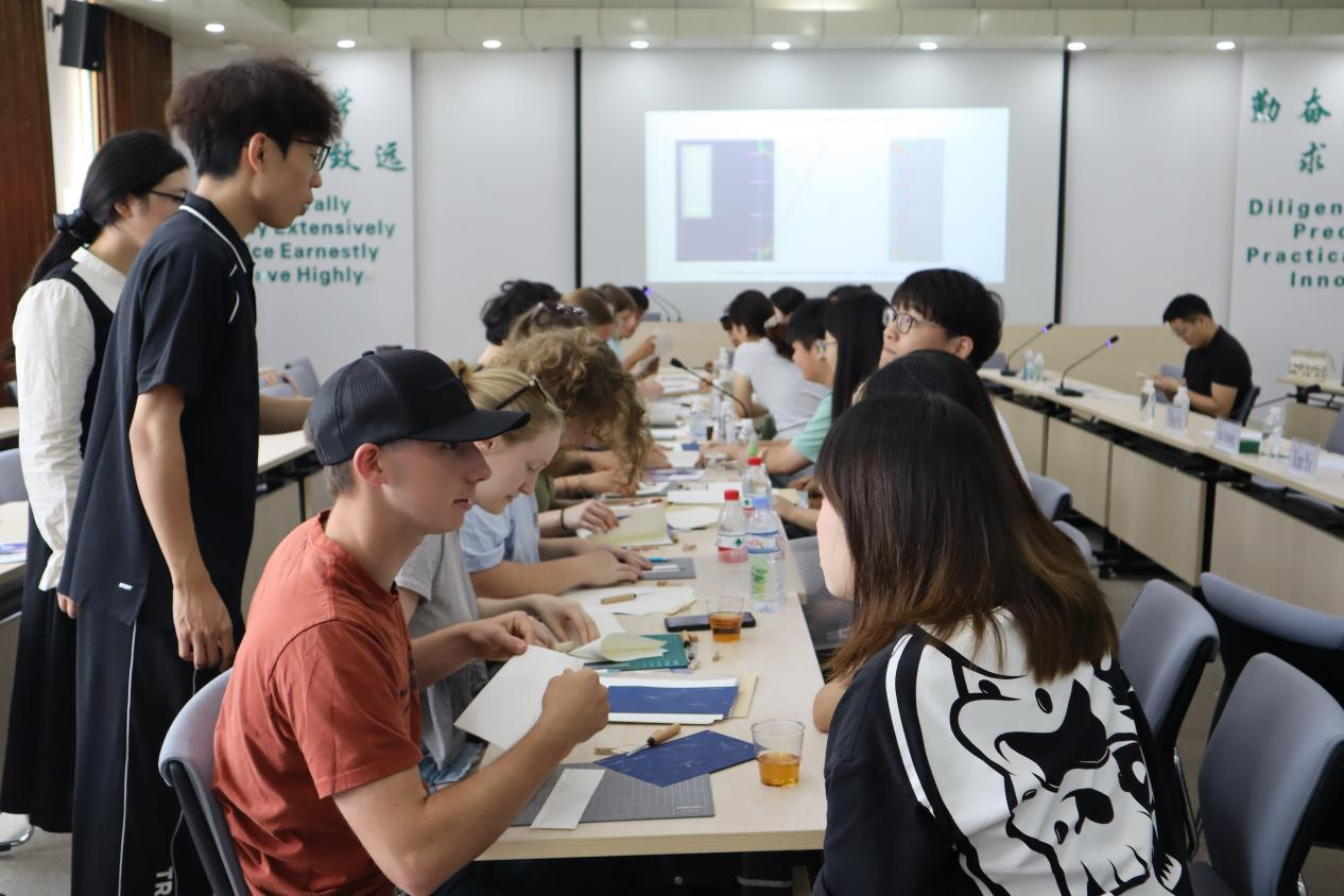活動(dòng)現(xiàn)場(chǎng),中國傳統(tǒng)文化體驗(yàn)環(huán)節(jié)成為最大亮點(diǎn),茶藝、琵琶曲藝、英文歌曲演唱、書法展示和傳統(tǒng)線裝書制作等項(xiàng)目依次展開。茶藝展示環(huán)節(jié),身著素雅漢服的工作人員行云流水般演示著溫杯、投茶、注水、分茶的傳統(tǒng)流程,在茶香裊裊中,留學(xué)生們仔細(xì)觀摩每一個(gè)細(xì)節(jié),接過茶杯輕啜細(xì)品,在甘醇茶湯里觸摸東方生活美學(xué)。琵琶演奏者指尖輕挑,悠揚(yáng)旋律流淌全場(chǎng),中外青年屏息聆聽,讓傳統(tǒng)民樂的韻味在空氣中交融。富有感染力的英文歌曲演唱,成為兩國青年情感共鳴的紐帶,為這場(chǎng)文化之約增添了青春活力。書法展示環(huán)節(jié)讓留學(xué)生們?cè)诠P墨之間感受中國漢字之美,傳遞了中國文化深厚底蘊(yùn)。線裝書制作環(huán)節(jié)中,中外學(xué)生分組協(xié)作,折頁、對(duì)齊、穿線、裝訂,共同完成一本線裝書,最后共同加蓋“!弊钟≌拢瑢⑦@份滿載情誼的手作成果作為紀(jì)念珍藏。